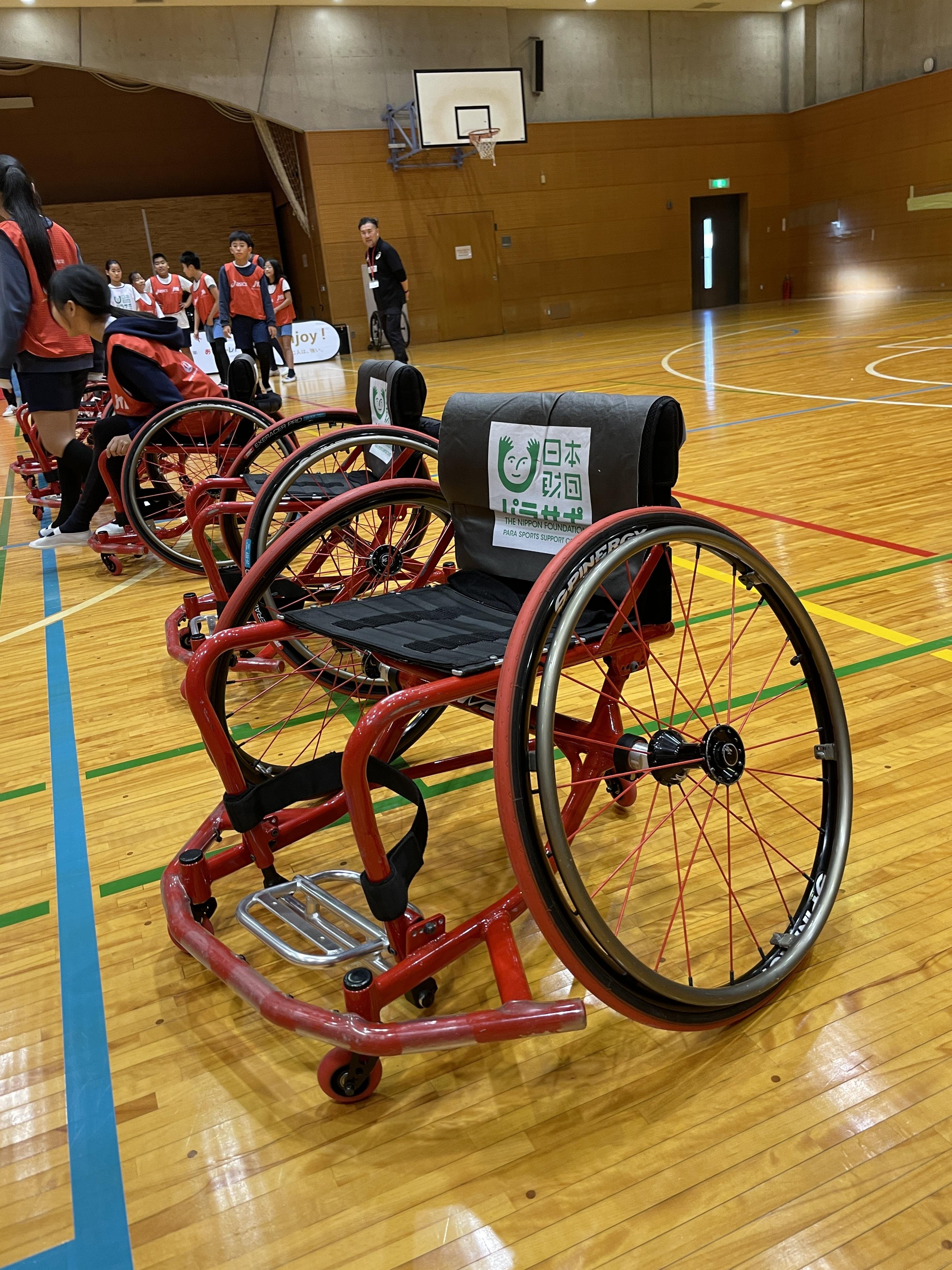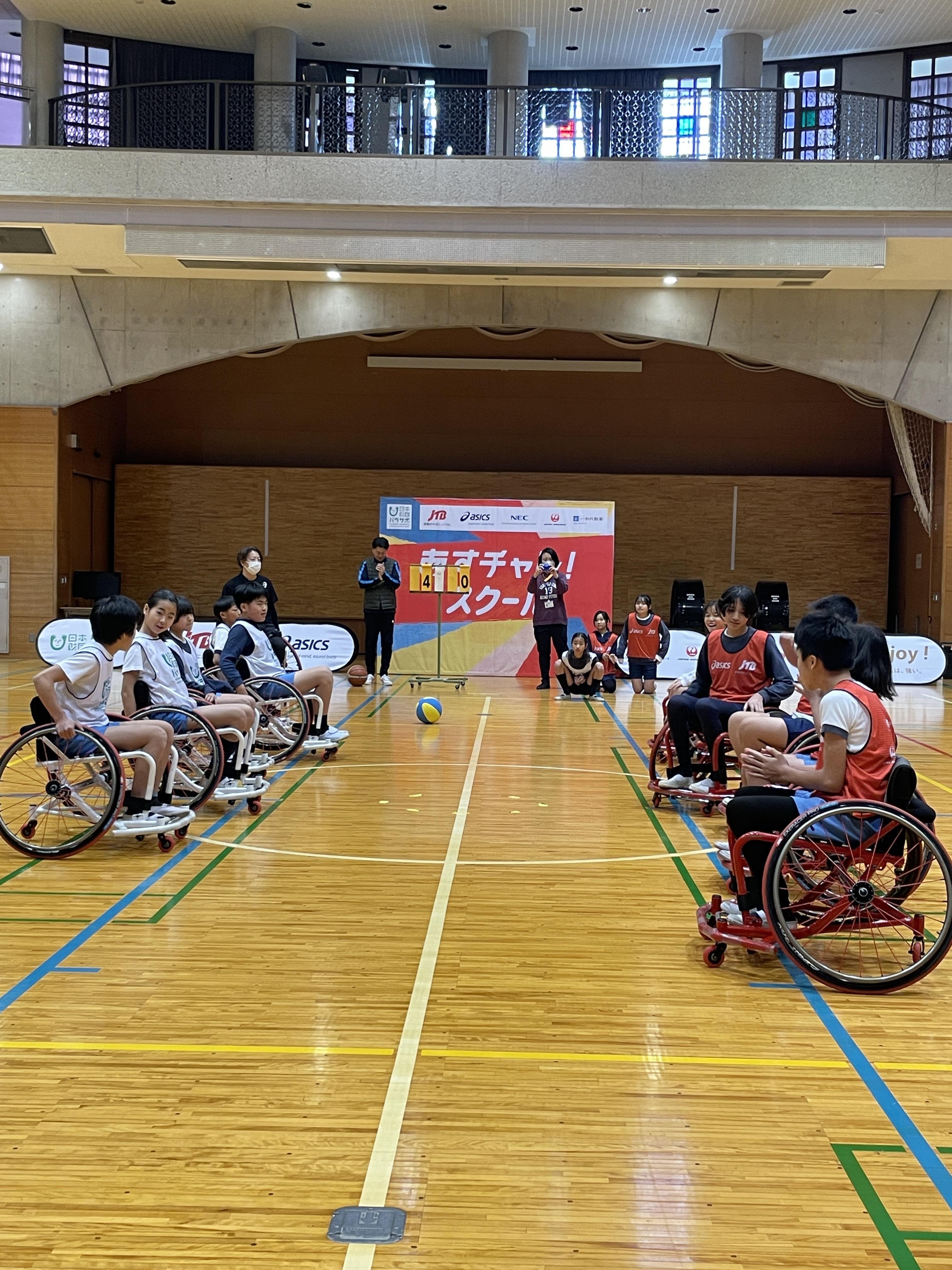5年生の福祉の学習の一環で、6年生と一緒にパラスポーツ体験型出前授業「あすチャレ!スクール」(主催:日本財団パラスポーツサポートセンター)で車いすバスケットボールプログラムを受講しました。