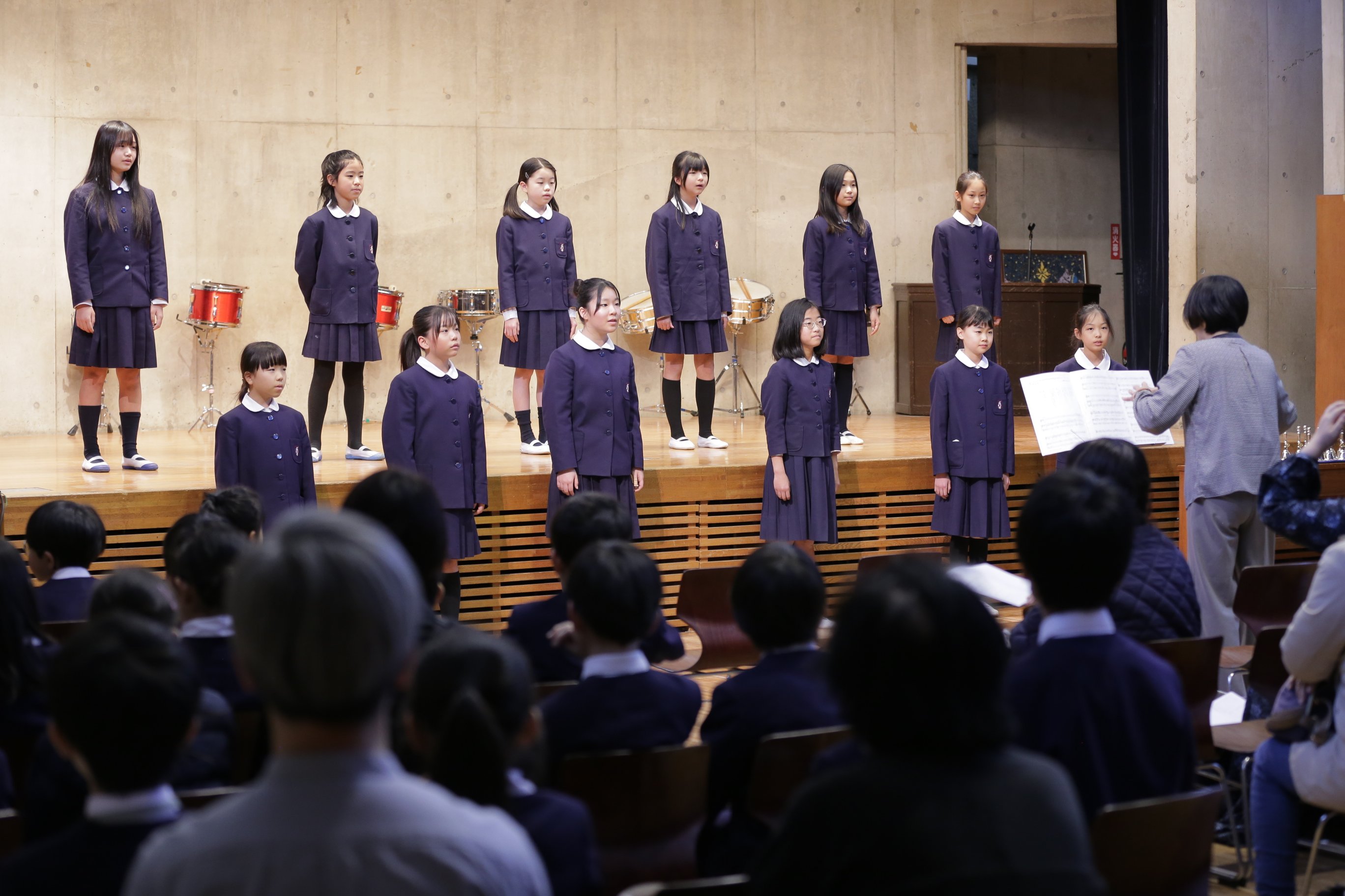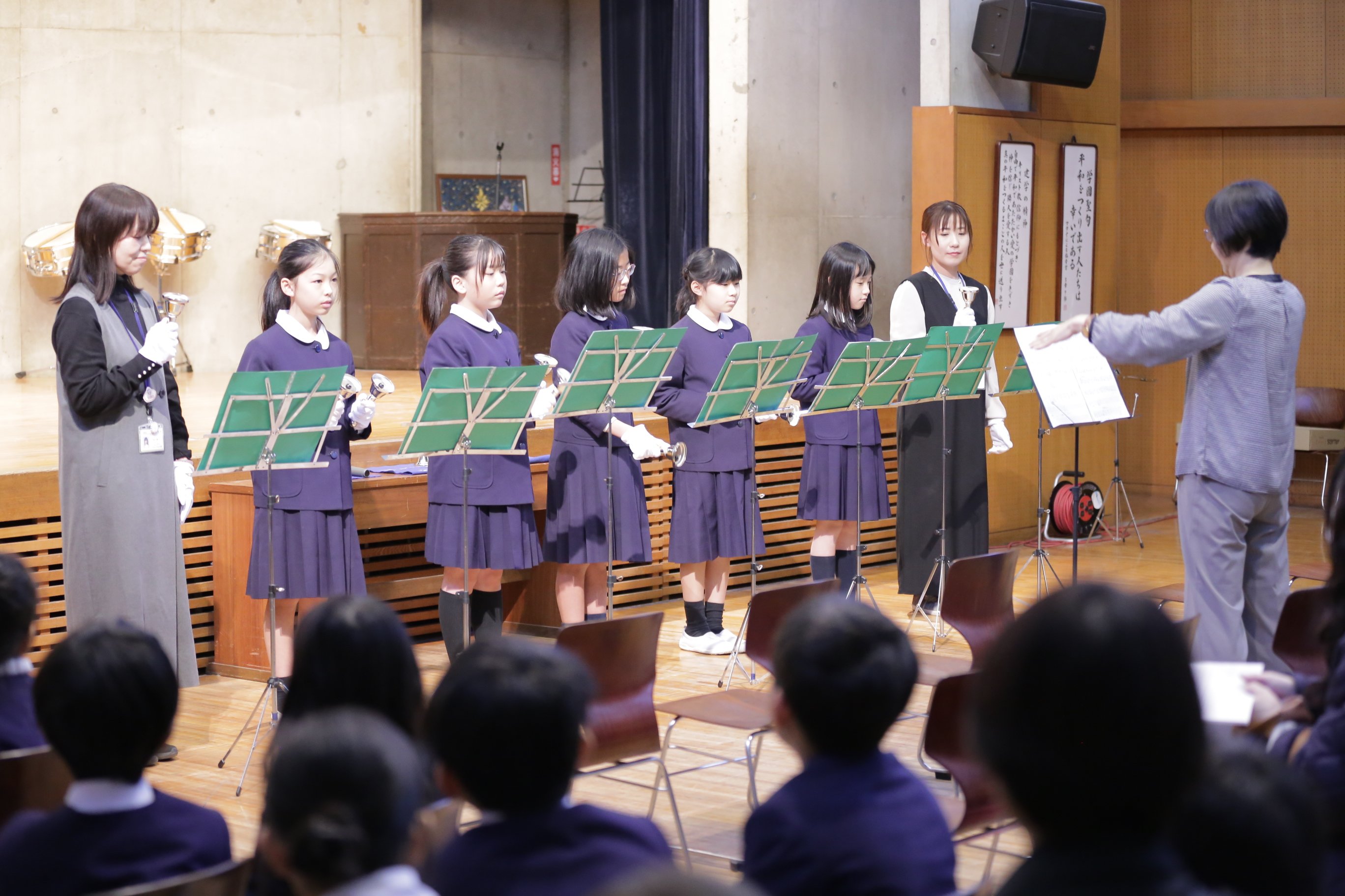 学習発表会では、4年生以上が週に1回行っている「選択音楽」とハンドベルクラブの発表、そして6年生が行う「卒業論文」の発表があります。