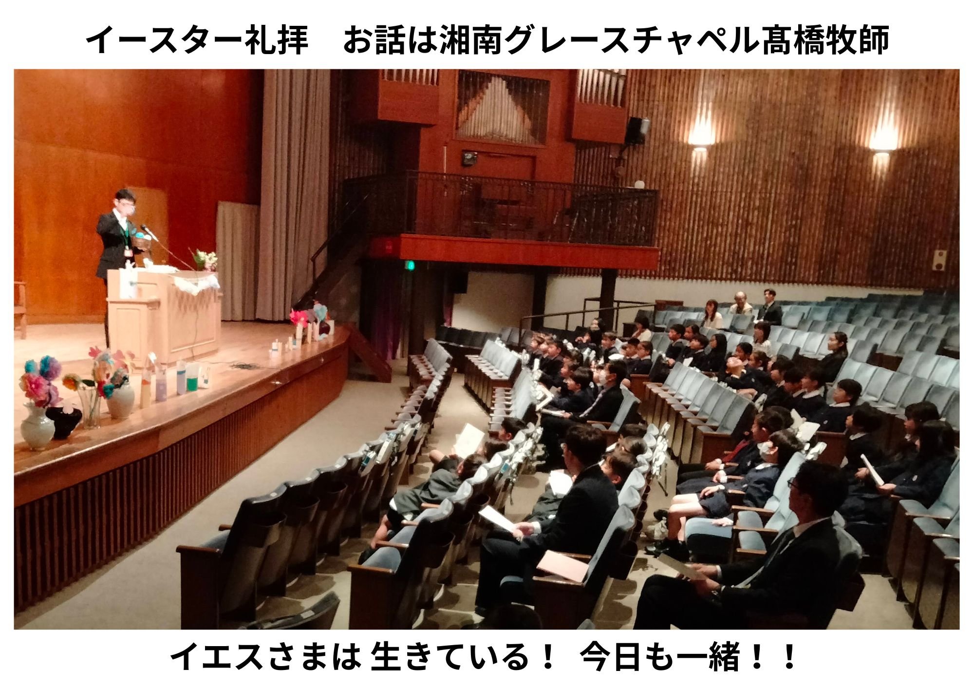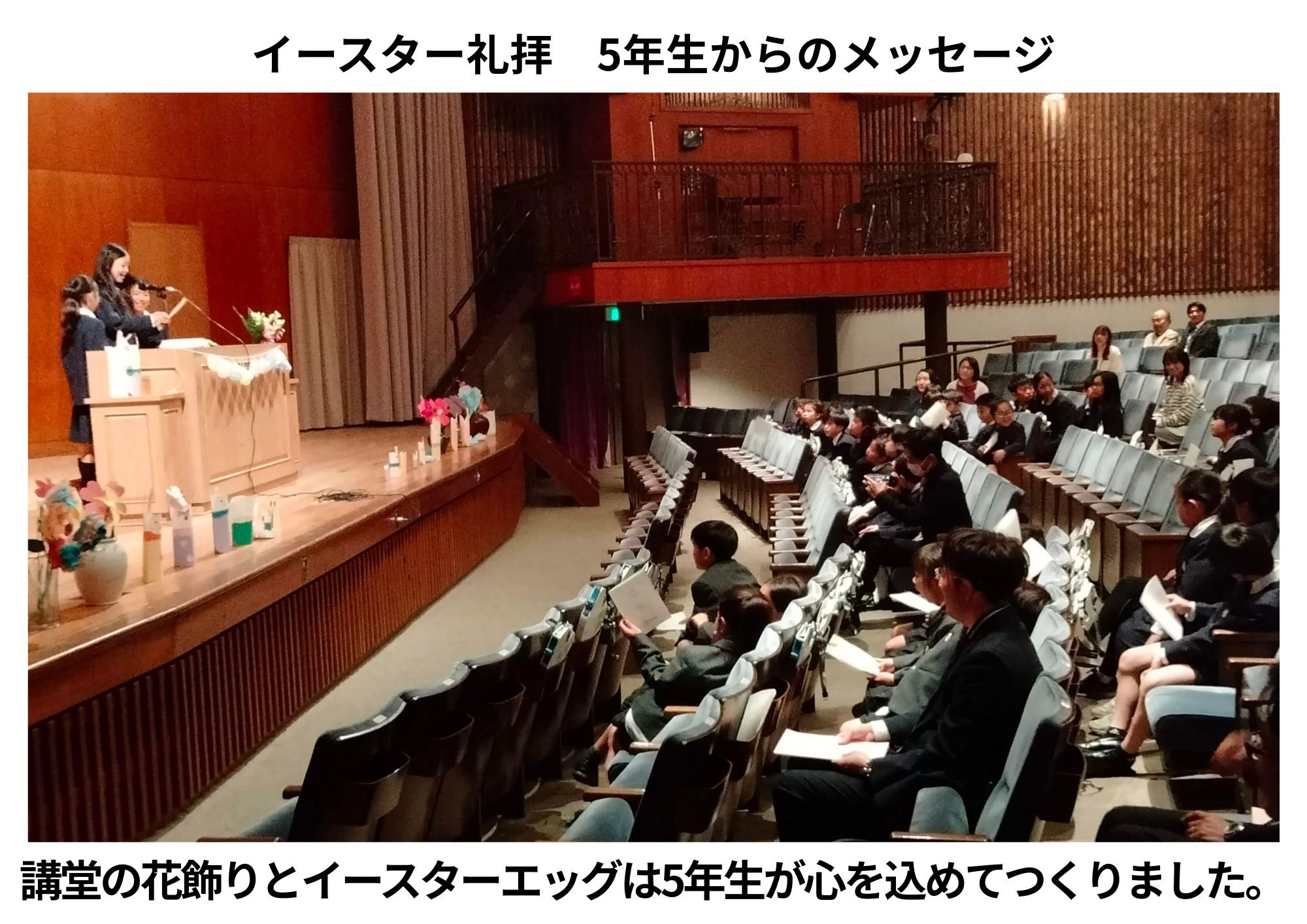 2026年4月17日 イースター礼拝 今日はイースター礼拝でした。賀川村島記念講堂でお話を伺いました。 メッセージはのポイントはイエスさまは生きている!今日も一緒!覚えて帰ってくださいね。 講堂の飾りつけとイースターエッグは5年生が作りました。帰る時にもらって帰ります。